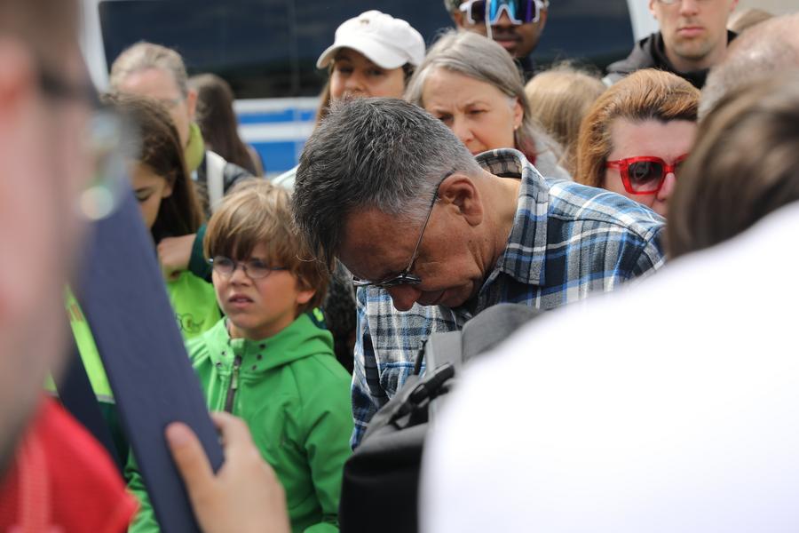 Pessoas participam de uma cerimônia em comemoração ao 80º aniversário do fim da Segunda Guerra Mundial na Europa, no Portão de Brandemburgo, em Berlim, Alemanha, em 8 de maio de 2025. (Xinhua/Du Zheyu)