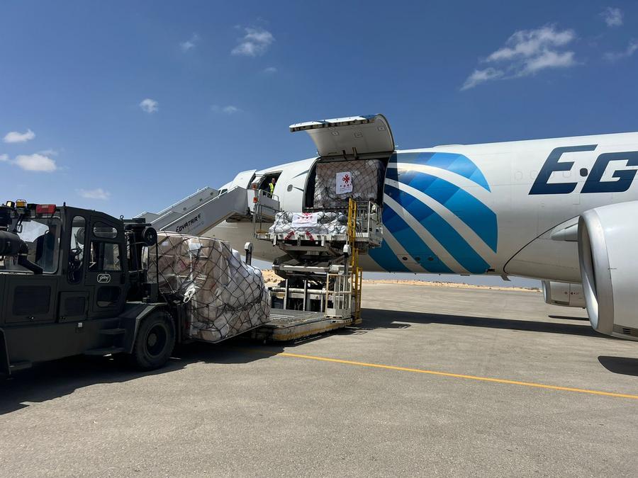 Trabalhadores descarregam suprimentos humanitários enviados pela China para a Faixa de Gaza de um avião no aeroporto de Al-Arish, na província do Norte do Sinai, Egito, em 19 de abril de 2024. (Xinhua)
