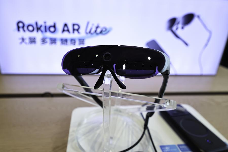 Óculos inteligente desenvolvido pela empresa de tecnologia Rokid, sediada em Hangzhou, é fotografado na loja principal da Rokid no distrito de Yujiang, em Yingtan, província de Jiangxi, no leste da China, em 10 de julho de 2025. (Xinhua/Liu Jinhai)