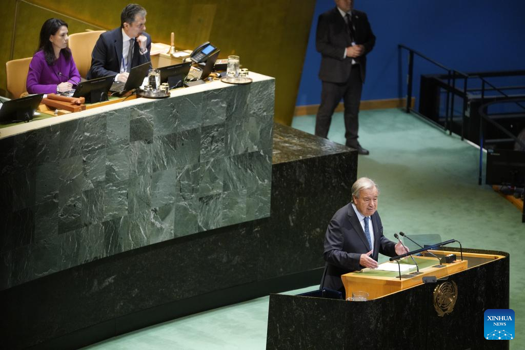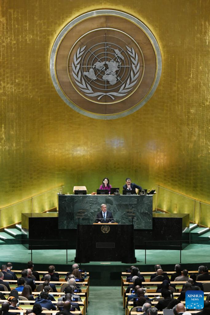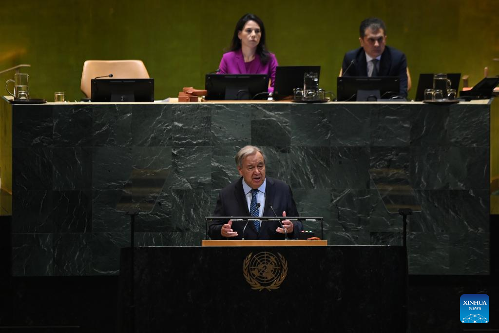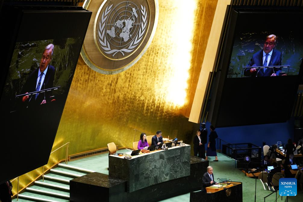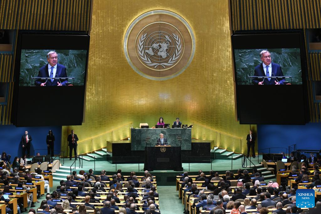 O secretário-geral da ONU, António Guterres, discursa na cerimônia de abertura do Debate Geral da 80ª sessão da Assembleia Geral das Nações Unidas (AGNU), na sede da ONU em Nova York, em 23 de setembro de 2025. Representantes dos Estados-membros da Organização das Nações Unidas (ONU), incluindo cerca de 150 chefes de Estado e de governo, se revezarão no pódio da Assembleia Geral das Nações Unidas (AGNU) para discursar sobre questões globais no debate geral da AGNU, que começou na terça-feira. (Xinhua/Wu Xiaoling)