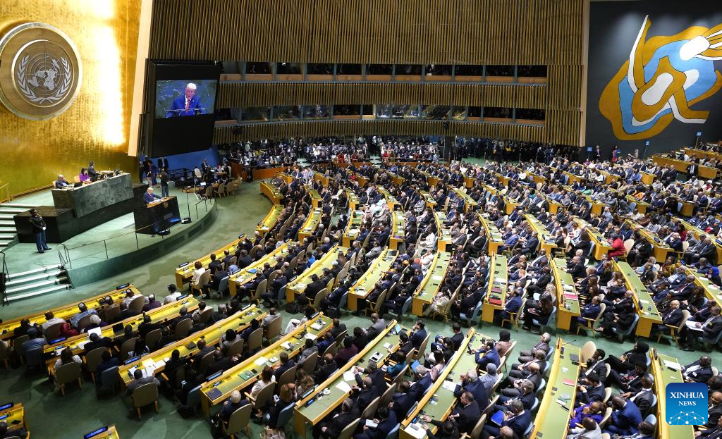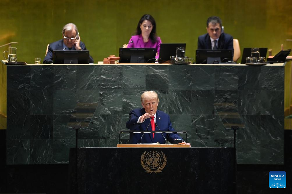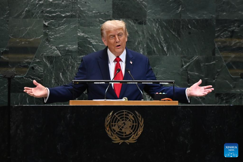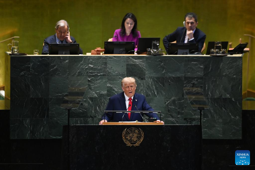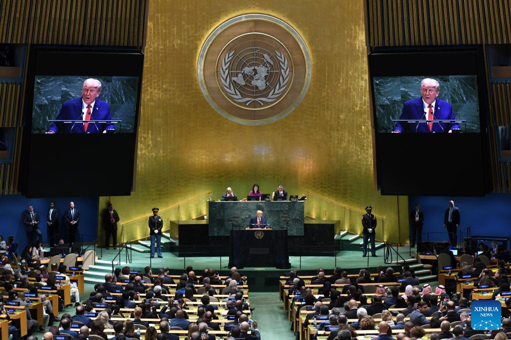 O presidente dos EUA, Donald Trump, discursa no Debate Geral da 80ª sessão da Assembleia Geral das Nações Unidas (AGNU) na sede da ONU em Nova York, em 23 de setembro de 2025. Representantes dos Estados-membros da Organização das Nações Unidas (ONU), incluindo cerca de 150 chefes de Estado e de governo, se revezarão no pódio da Assembleia Geral das Nações Unidas (AGNU) para discursar sobre questões globais no debate geral da AGNU, que começou na terça-feira. (Xinhua/Li Rui)