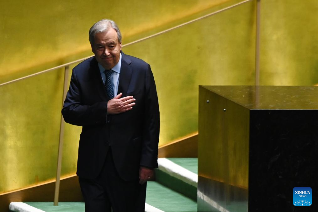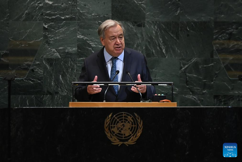 O secretário-geral da ONU, António Guterres, discursa na abertura do Debate Geral da 80ª sessão da Assembleia Geral das Nações Unidas (AGNU), na sede da ONU em Nova York, em 23 de setembro de 2025. Representantes dos Estados-membros da Organização das Nações Unidas (ONU), incluindo cerca de 150 chefes de Estado e de governo, se revezarão no pódio da Assembleia Geral das Nações Unidas (AGNU) para discursar sobre questões globais no debate geral da AGNU, que começou na terça-feira. (Xinhua/Wu Xiaoling)