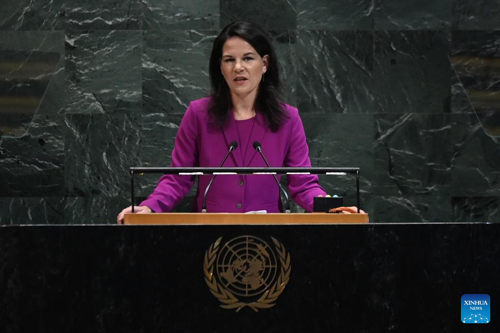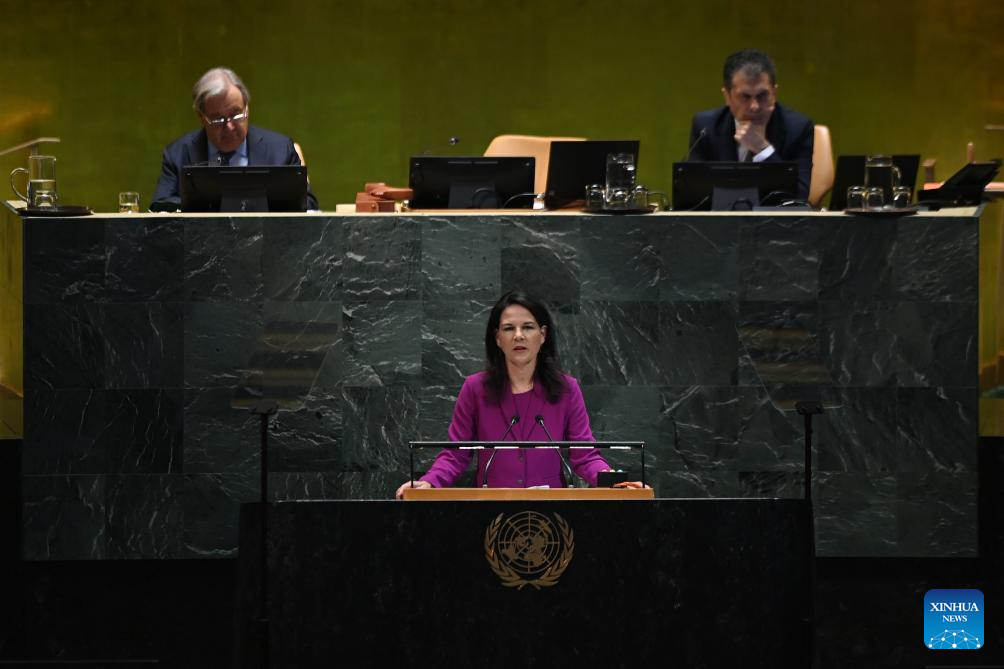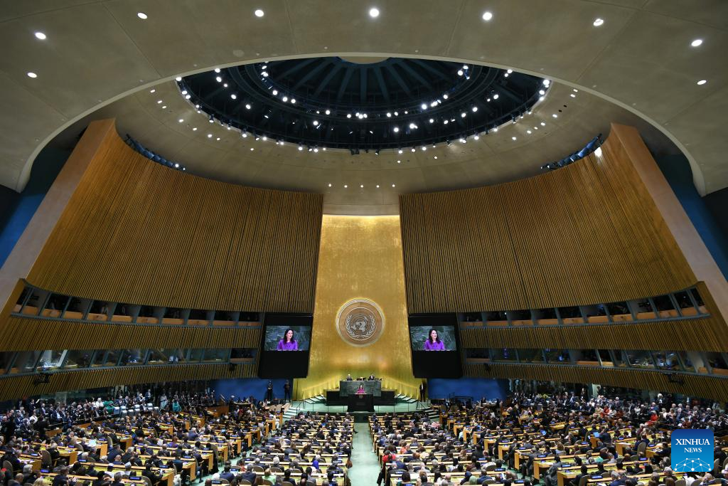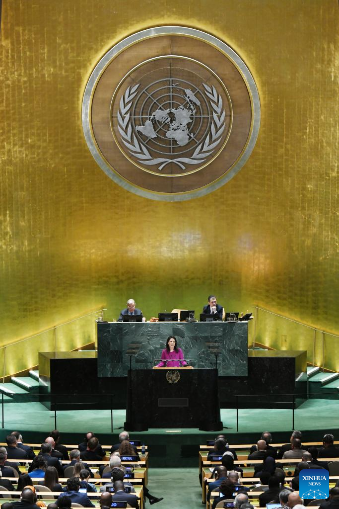 A presidente da Assembleia Geral das Nações Unidas, Annalena Baerbock, discursa na cerimônia de abertura do Debate Geral da 80ª sessão da Assembleia Geral das Nações Unidas (AGNU), na sede da ONU em Nova York, em 23 de setembro de 2025. Representantes dos Estados-membros da Organização das Nações Unidas (ONU), incluindo cerca de 150 chefes de Estado e de governo, se revezarão no pódio da Assembleia Geral das Nações Unidas (AGNU) para discursar sobre questões globais no debate geral da AGNU, que começou na terça-feira. (Xinhua/Li Rui)