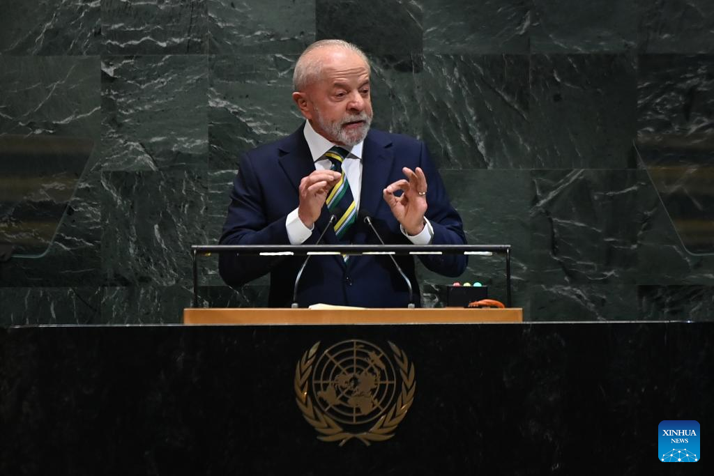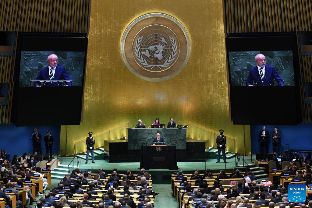 O presidente brasileiro, Luiz Inácio Lula da Silva, discursa no Debate Geral da 80ª sessão da Assembleia Geral das Nações Unidas (AGNU), na sede da ONU em Nova York, em 23 de setembro de 2025. Representantes dos Estados-membros da Organização das Nações Unidas (ONU), incluindo cerca de 150 chefes de Estado e de governo, se revezarão no pódio da Assembleia Geral das Nações Unidas (AGNU) para discursar sobre questões globais no debate geral da AGNU, que começou na terça-feira. (Xinhua/Li Rui)