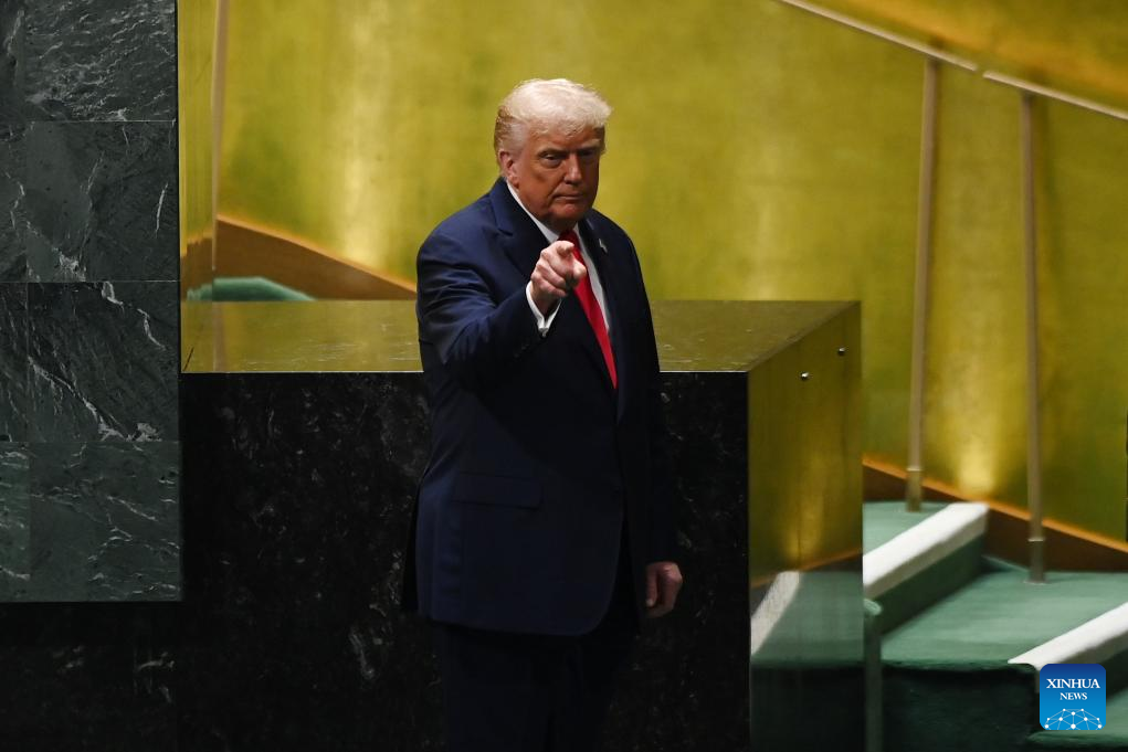 O presidente dos EUA, Donald Trump, gesticula após discursar no Debate Geral da 80ª sessão da Assembleia Geral das Nações Unidas Assembleia Geral das Nações Unidas (AGNU) na sede da ONU em Nova York, em 23 de setembro de 2025. Representantes dos Estados-membros da Organização das Nações Unidas (ONU), incluindo cerca de 150 chefes de Estado e de governo, se revezarão no pódio da Assembleia Geral das Nações Unidas (AGNU) para discursar sobre questões globais no debate geral da AGNU, que começou na terça-feira. (Xinhua/Li Rui)