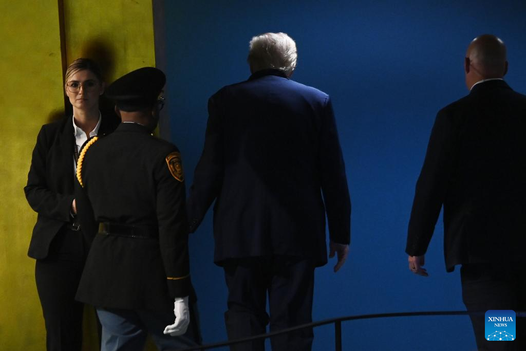 O presidente dos EUA, Donald Trump (2º à direita), sai após discursar no Debate Geral da 80ª sessão da Assembleia Geral das Nações Unidas (AGNU), na sede da ONU em Nova York, em 23 de setembro de 2025. Representantes dos Estados-membros da Organização das Nações Unidas (ONU), incluindo cerca de 150 chefes de Estado e de governo, se revezarão no pódio da Assembleia Geral das Nações Unidas (AGNU) para discursar sobre questões globais no debate geral da AGNU, que começou na terça-feira. (Xinhua/Li Rui)