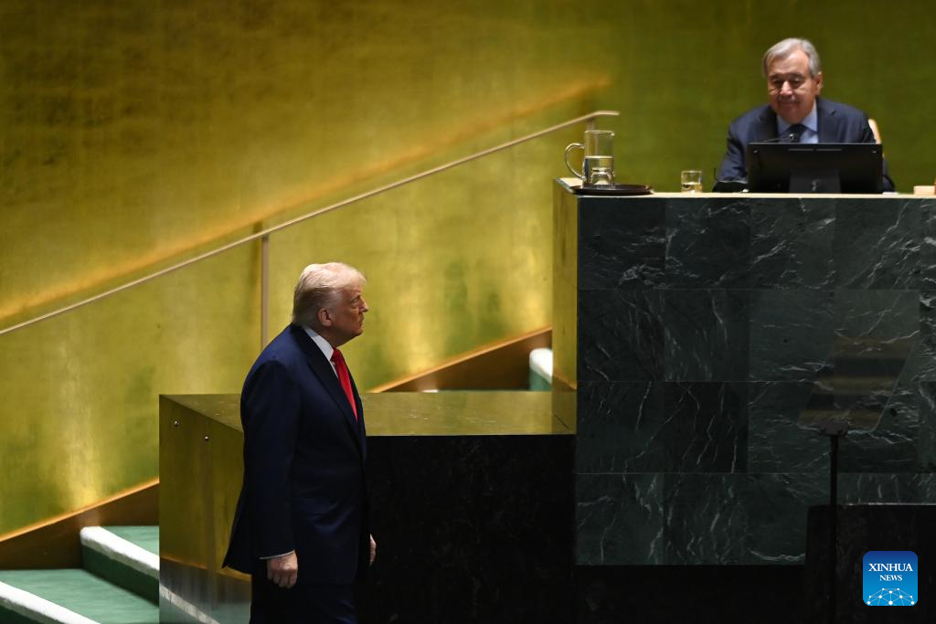 O presidente dos EUA, Donald Trump (esquerda), sobe ao pódio para discursar no Debate Geral da 80ª sessão da Assembleia Geral das Nações Unidas (AGNU), na sede da ONU em Nova York, em 23 de setembro de 2025. Representantes dos Estados-membros da Organização das Nações Unidas (ONU), incluindo cerca de 150 chefes de Estado e de governo, se revezarão no pódio da Assembleia Geral das Nações Unidas (AGNU) para discursar sobre questões globais no debate geral da AGNU, que começou na terça-feira. (Xinhua/Li Rui)