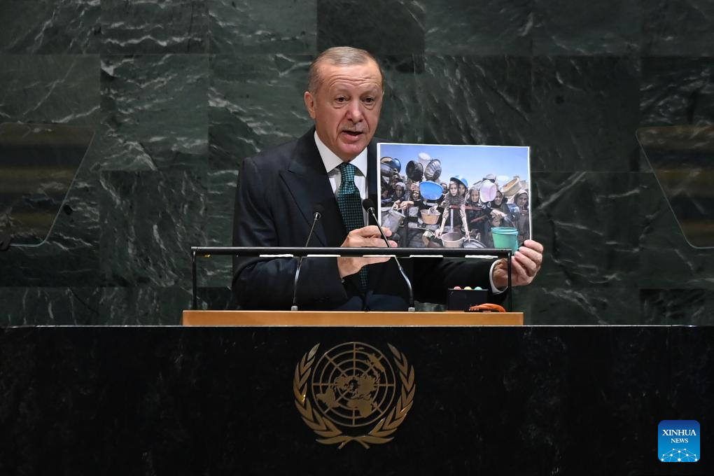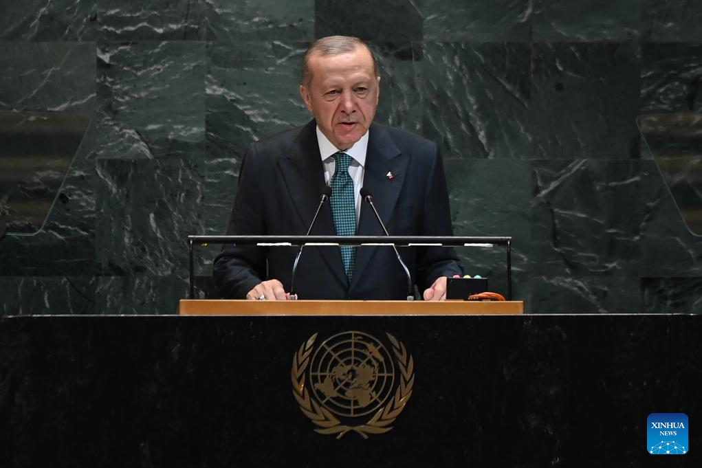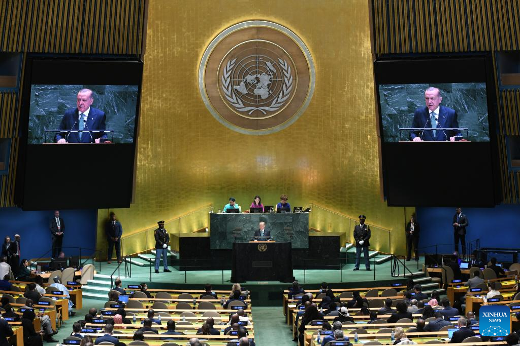 O presidente turco, Recep Tayyip Erdogan, discursa no Debate Geral da 80ª sessão da Assembleia Geral das Nações Unidas (AGNU) na sede da ONU em Nova York, 23 de setembro de 2025. (Xinhua/Li Rui)