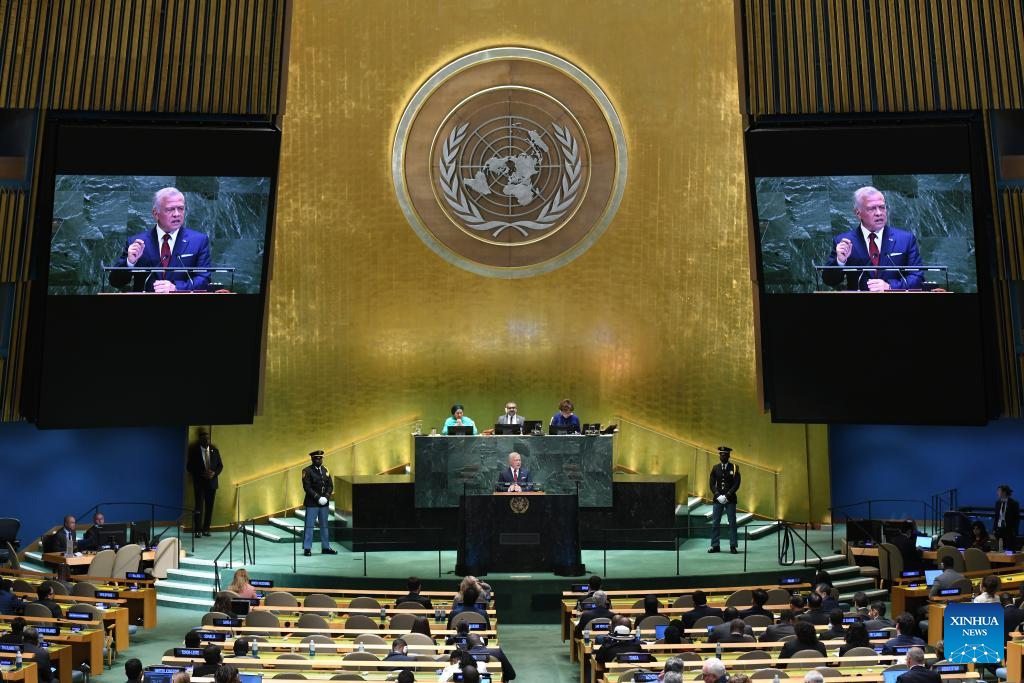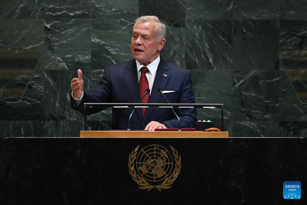 O rei Abdullah II da Jordânia discursa no Debate Geral da 80ª sessão da Assembleia Geral das Nações Unidas (AGNU), na sede da ONU em Nova York, em 23 de setembro de 2025. (Xinhua/Li Rui)
