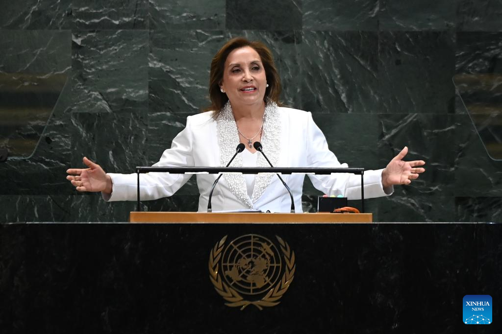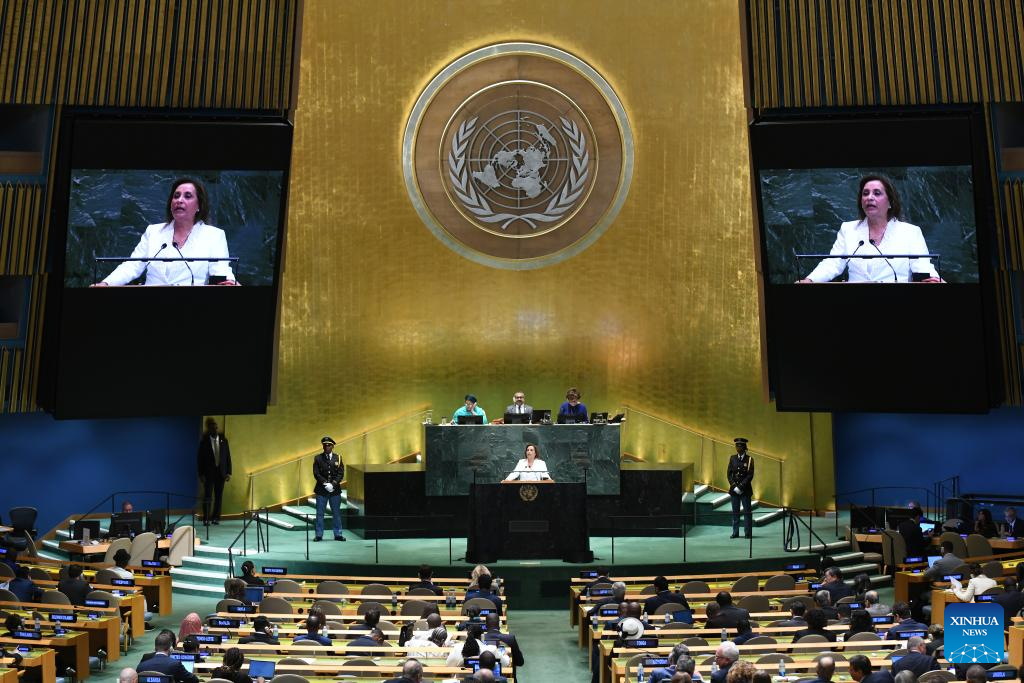 A presidente peruana, Dina Boluarte, discursa no Debate Geral da 80ª sessão da Assembleia Geral das Nações Unidas (AGNU) na sede da ONU em Nova York, 23 de setembro de 2025. (Xinhua/Li Rui)