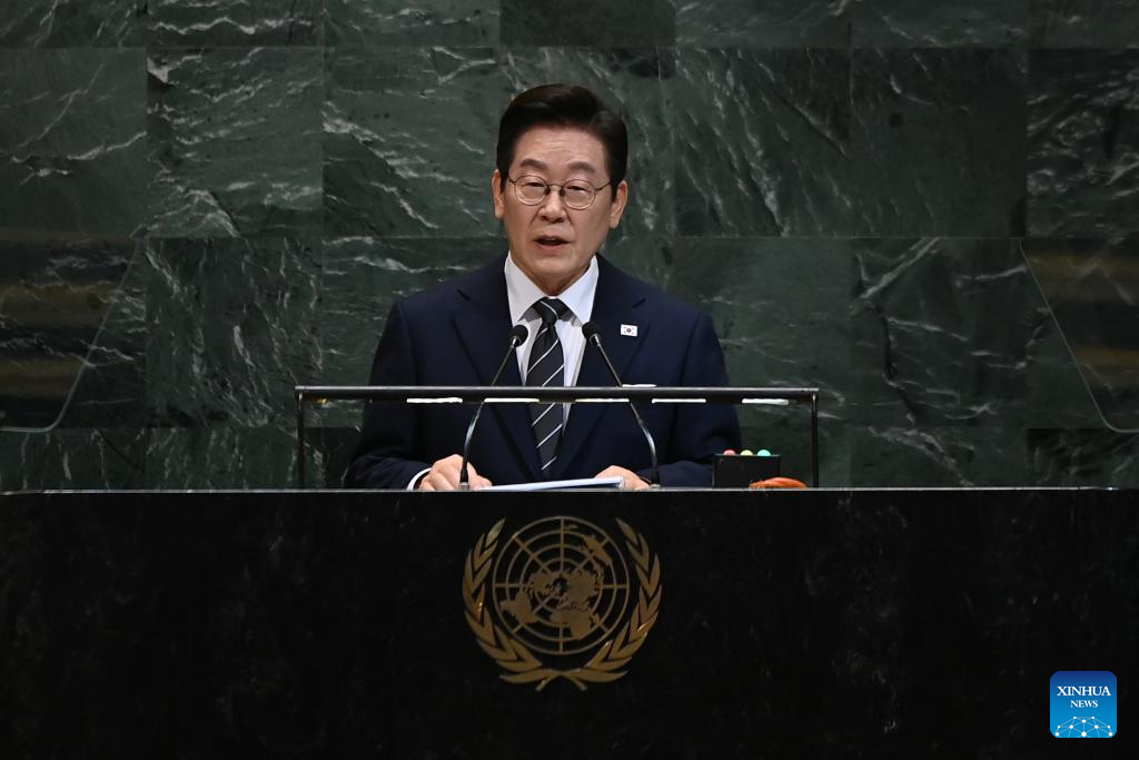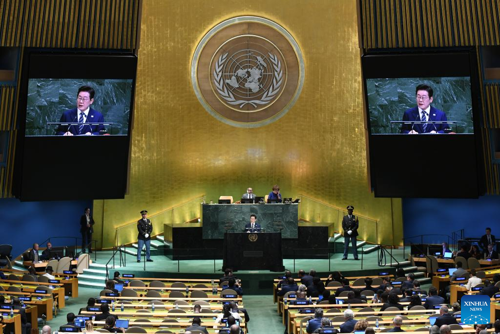 O presidente sul-coreano, Lee Jae-myung, discursa no Debate Geral da 80ª sessão da Assembleia Geral das Nações Unidas (AGNU) na sede da ONU em Nova York, 23 de setembro de 2025. (Xinhua/Li Rui)