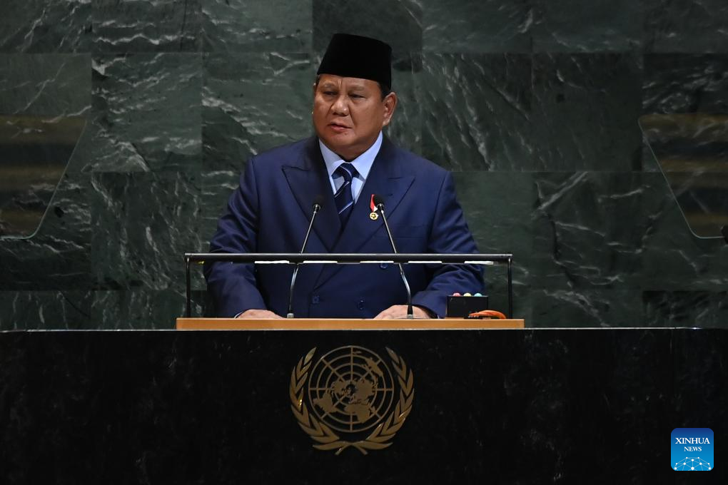O presidente indonésio, Prabowo Subianto, discursa no Debate Geral da 80ª sessão da Assembleia Geral das Nações Unidas (AGNU), na sede da ONU em Nova York, em 23 de setembro de 2025. (Xinhua/Li Rui)
