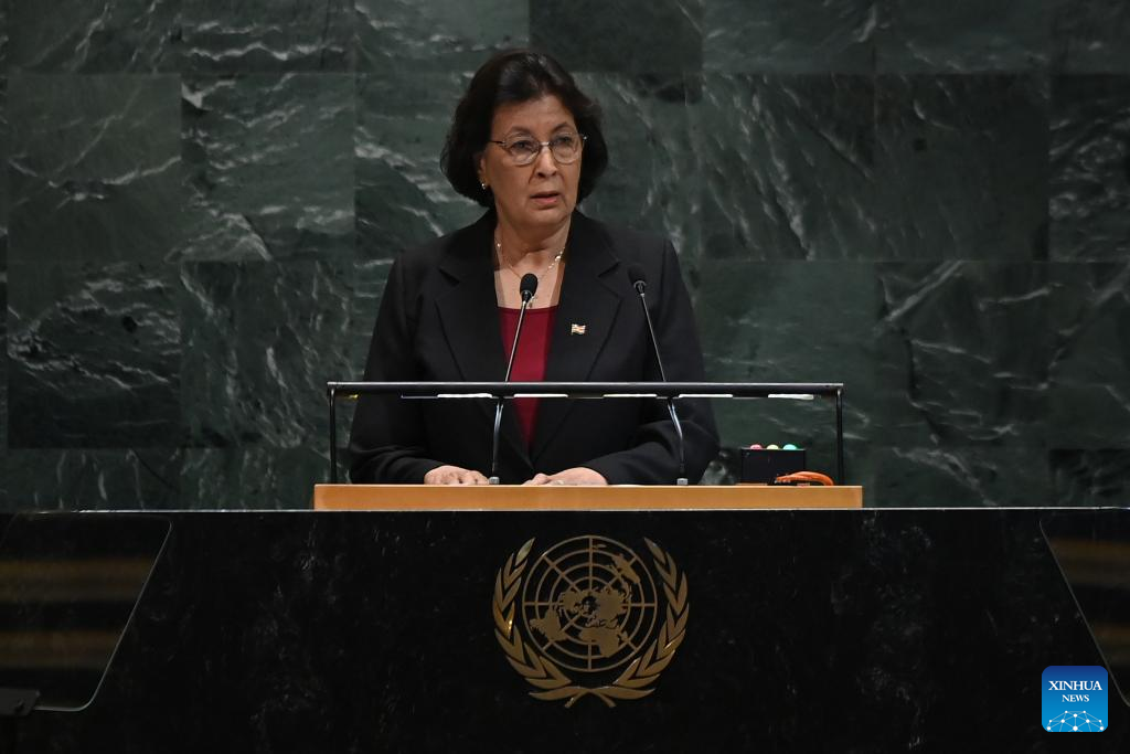 A presidente surinamesa, Jennifer Simons, discursa no Debate Geral da 80ª sessão da Assembleia Geral das Nações Unidas (AGNU) na sede da ONU em Nova York, 23 de setembro de 2025. (Xinhua/Li Rui)