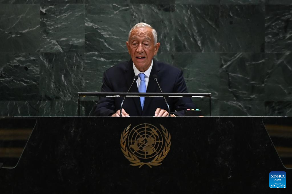 O presidente português, Marcelo Rebelo de Sousa, discursa no Debate Geral da 80ª sessão da Assembleia Geral das Nações Unidas (AGNU) na sede da ONU em Nova York, em 23 de setembro de 2025. (Xinhua/Li Rui)