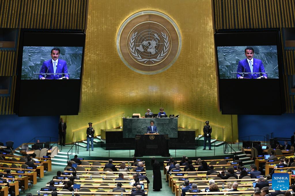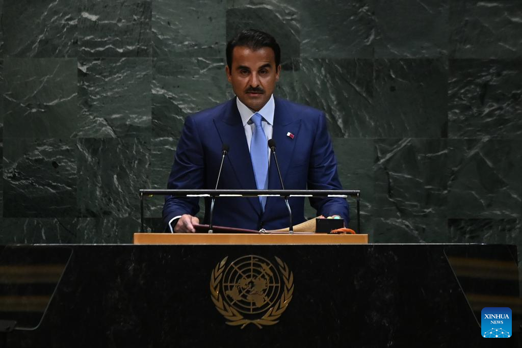 O emir do Catar, xeique Tamim bin Hamad Al Thani, discursa no Debate Geral da 80ª sessão da Assembleia Geral das Nações Unidas (AGNU) na sede da ONU em Nova York, em 23 de setembro de 2025. (Xinhua/Li Rui)