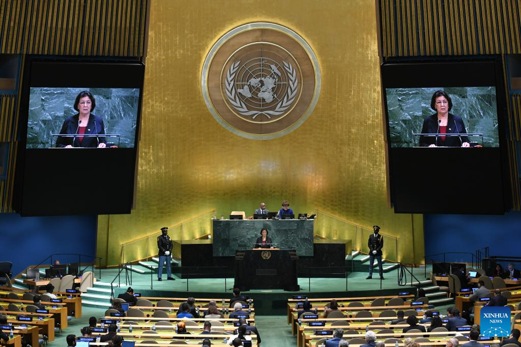 A presidente da Assembleia Geral das Nações Unidas, Annalena Baerbock (centro), bate o martelo para iniciar o Debate Geral da 80ª sessão da Assembleia Geral das Nações Unidas (AGNU), na sede da ONU em Nova York, em 23 de setembro de 2025. Representantes dos Estados-membros da Organização das Nações Unidas (ONU), incluindo cerca de 150 chefes de Estado e de governo, se revezarão no pódio da Assembleia Geral das Nações Unidas (AGNU) para discursar sobre questões globais no debate geral da AGNU, que começou na terça-feira. (Xinhua/Wu Xiaoling)