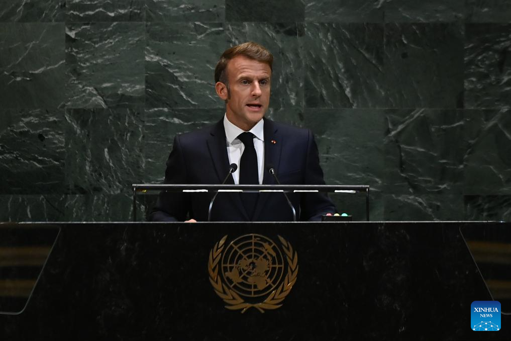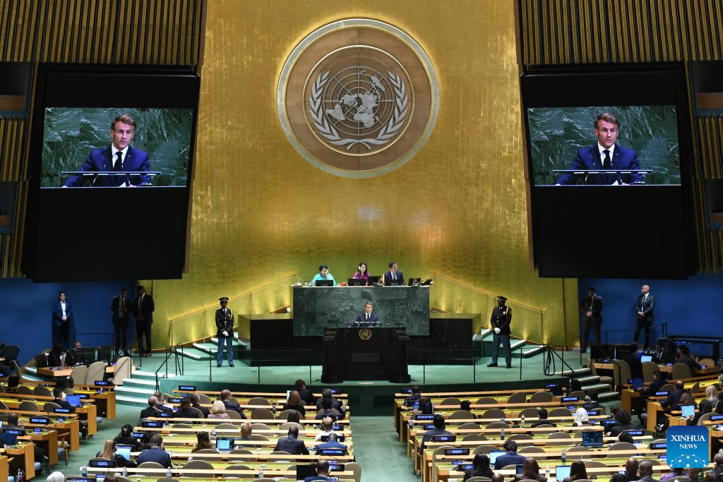 O presidente francês, Emmanuel Macron, discursa no Debate Geral da 80ª sessão da Assembleia Geral das Nações Unidas (AGNU), na sede da ONU em Nova York, em 23 de setembro de 2025. (Xinhua/Li Rui)