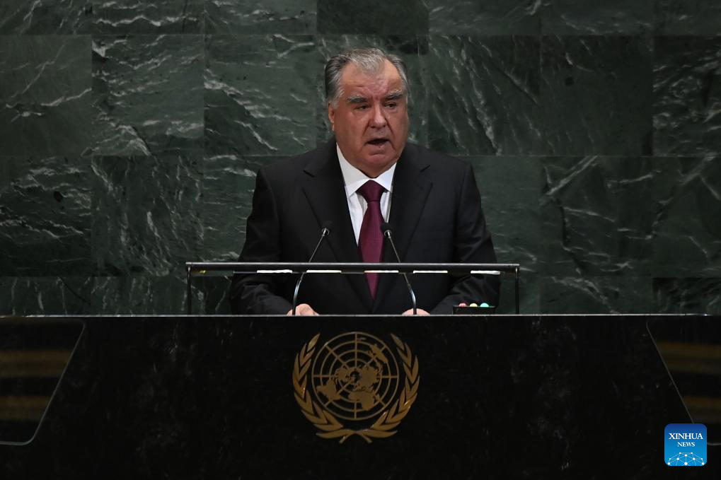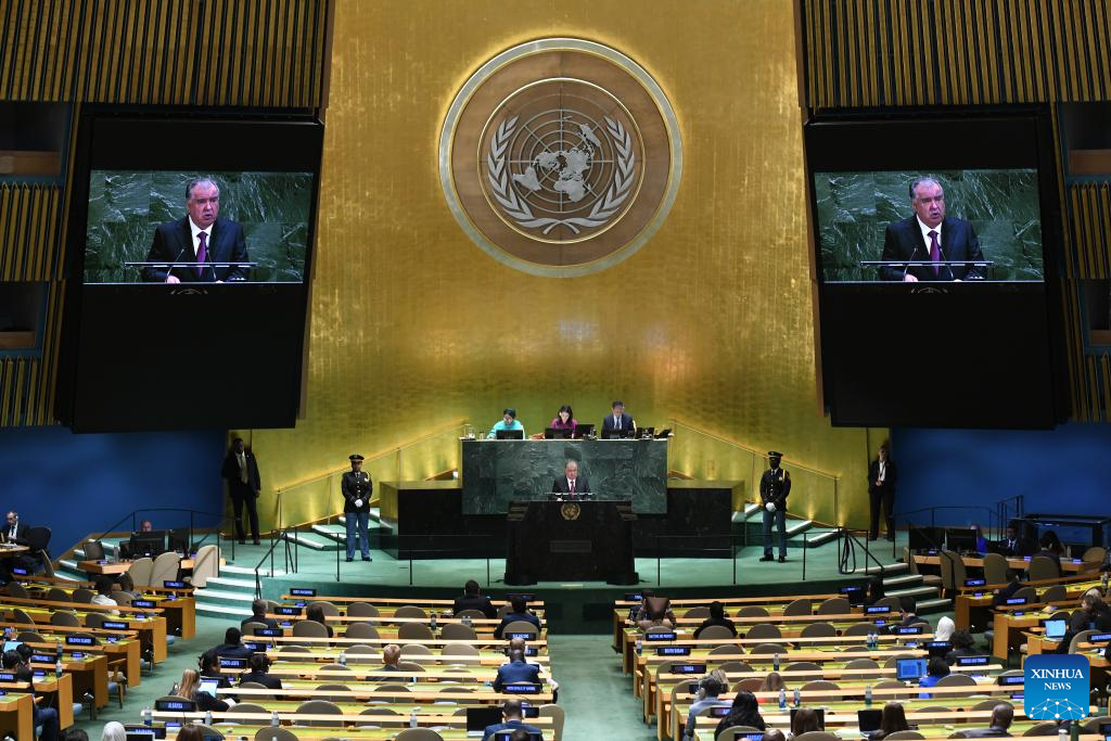 O presidente tajique, Emomali Rahmon, discursa no Debate Geral da 80ª sessão da Assembleia Geral das Nações Unidas (AGNU) na sede da ONU em Nova York, 23 de setembro de 2025. (Xinhua/Li Rui)