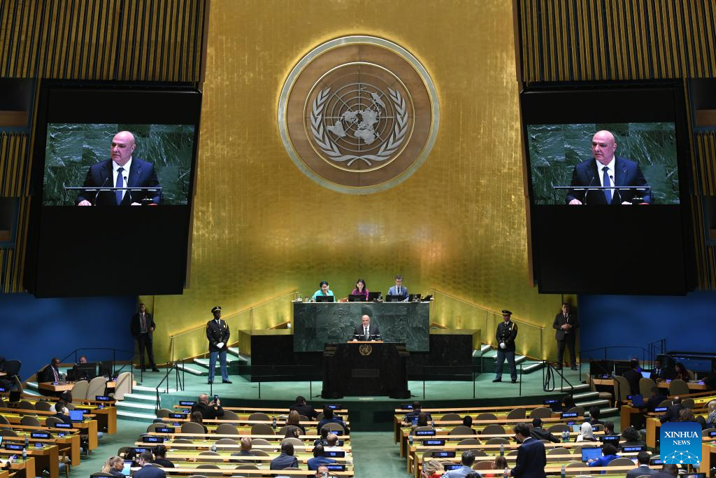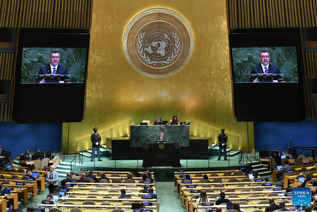 O presidente quirguiz, Sadyr Zhaparov, discursa no Debate Geral da 80ª sessão da Assembleia Geral das Nações Unidas (AGNU), na sede da ONU em Nova York. 23 de setembro de 2025. (Xinhua/Li Rui)