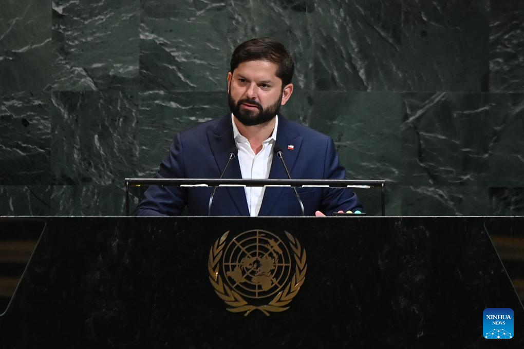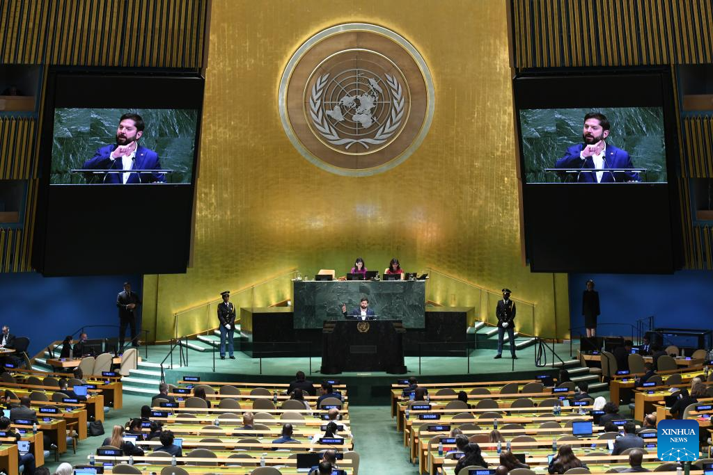 O presidente chileno, Gabriel Boric, discursa no Debate Geral da 80ª sessão da Assembleia Geral das Nações Unidas (AGNU), na sede da ONU em Nova York, em 23 de setembro de 2025. (Xinhua/Li Rui)