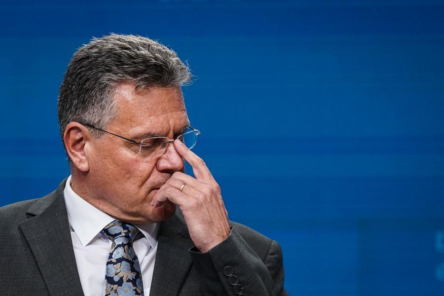 O chefe de comércio da UE, Maros Sefcovic, participa de coletiva de imprensa conjunta em Bruxelas, Bélgica, em 14 de julho de 2025. (Xinhua/Peng Ziyang)