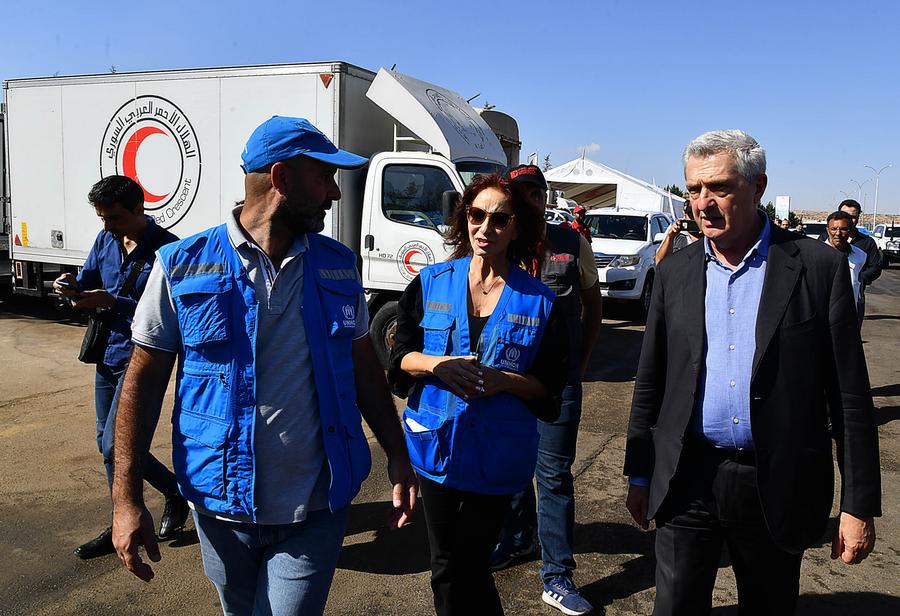 O Alto Comissariado das Nações Unidas para Refugiados (ACNUR), Filippo Grandi (1º à direita, frente), visita a travessia de Jdeidet Yabous, entre a Síria e o Líbano, em 7 de outubro de 2024. (Foto por Ammar Safarjalani/Xinhua)