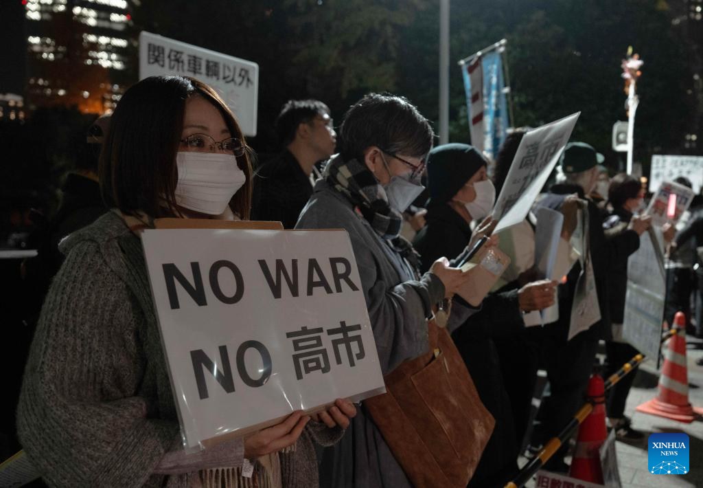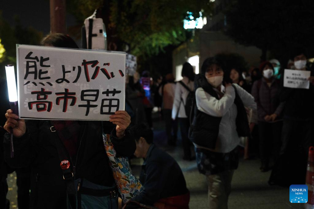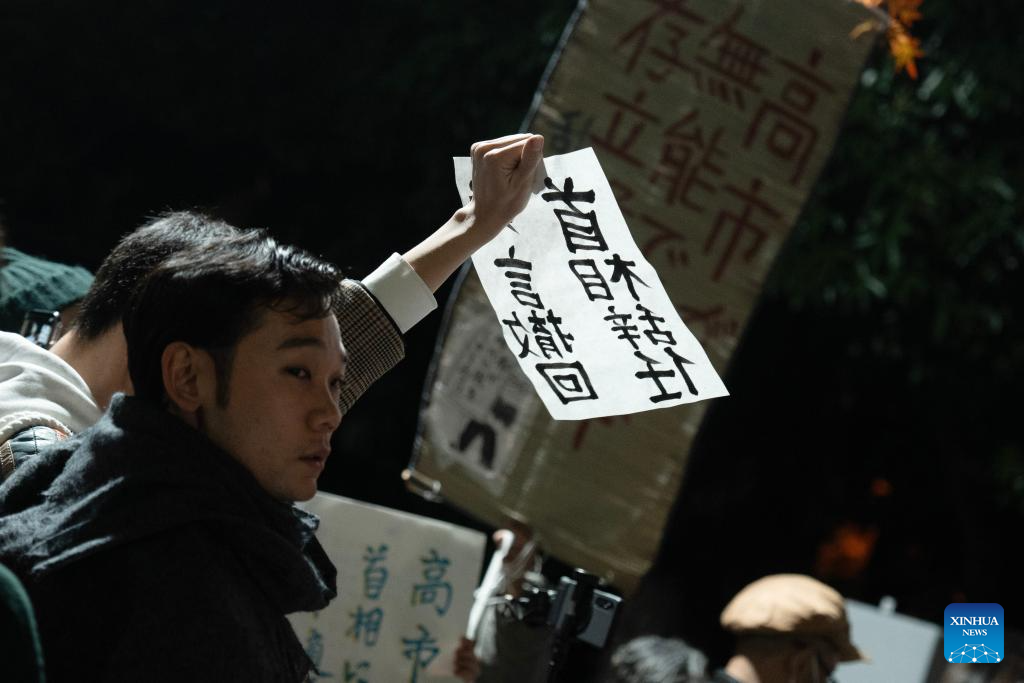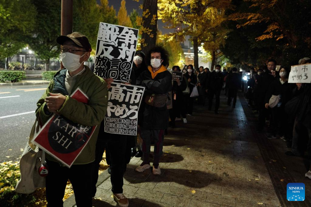 Tóquio, 22 nov (Xinhua) -- Centenas de japoneses fizeram um protesto em frente à residência oficial da primeira-ministra em Tóquio na sexta-feira, exigindo que a primeira-ministra Sanae Takaichi se retratasse de suas recentes declarações equivocadas sobre Taiwan, desse uma explicação e um pedido de desculpas.