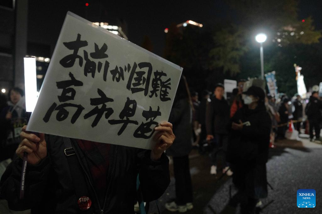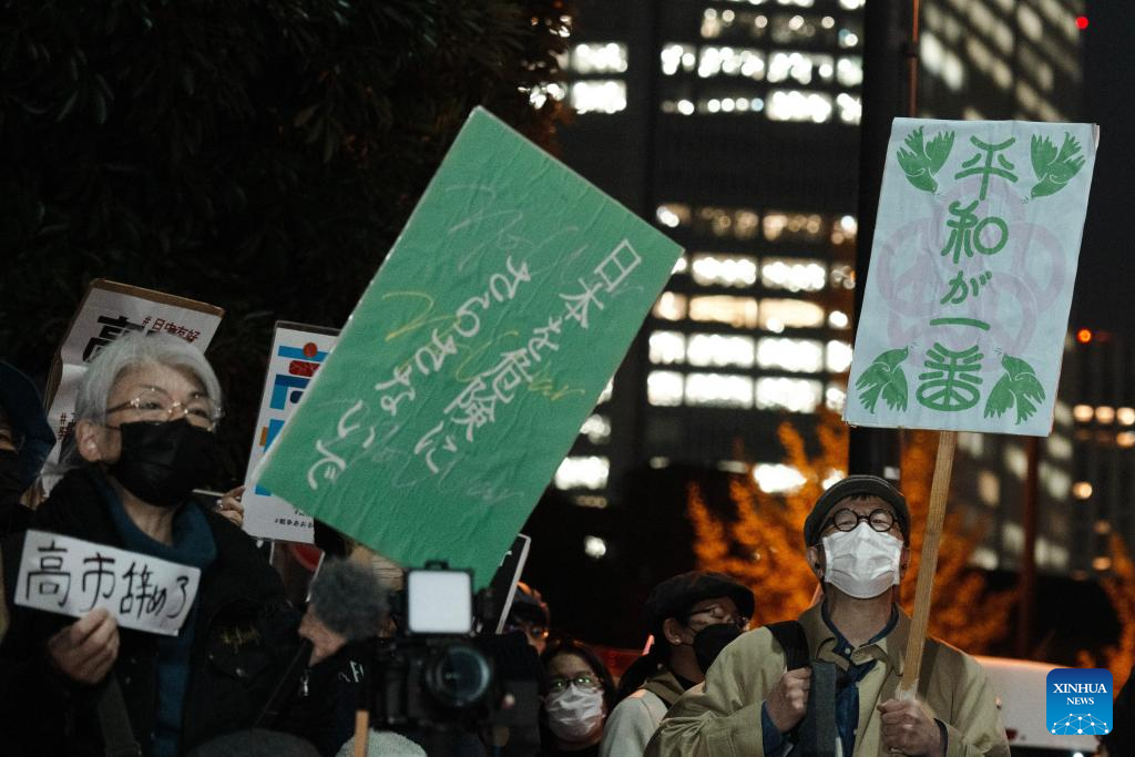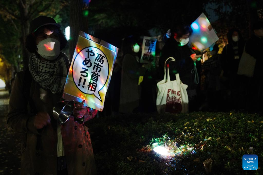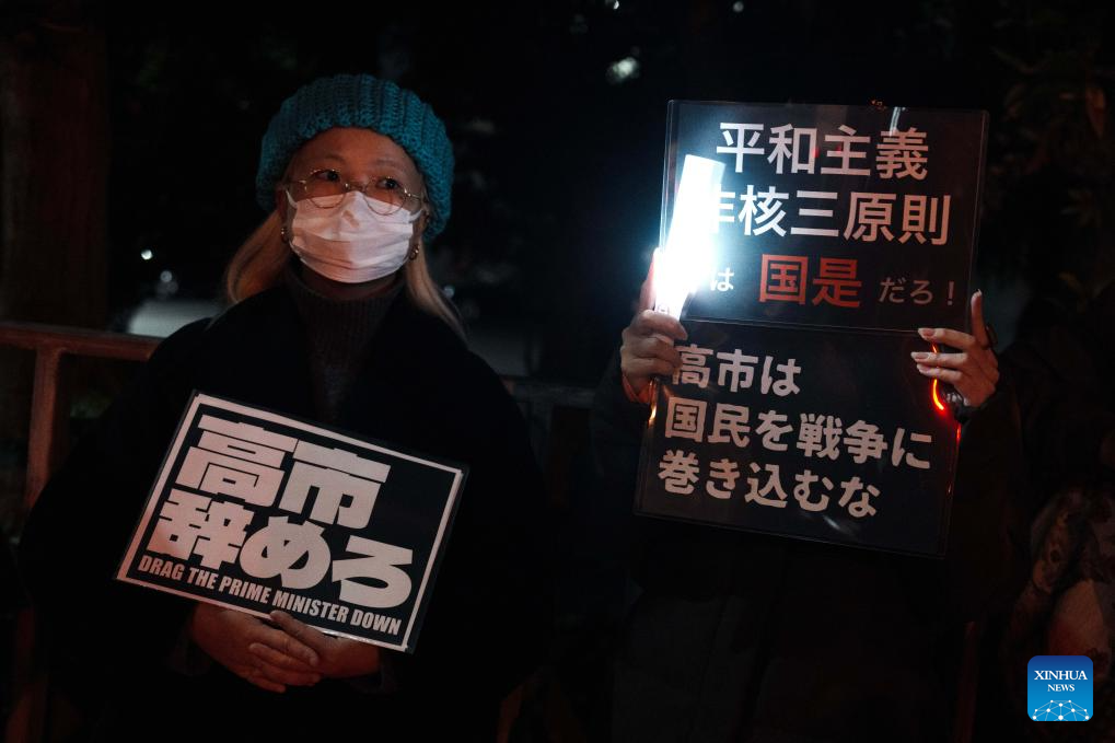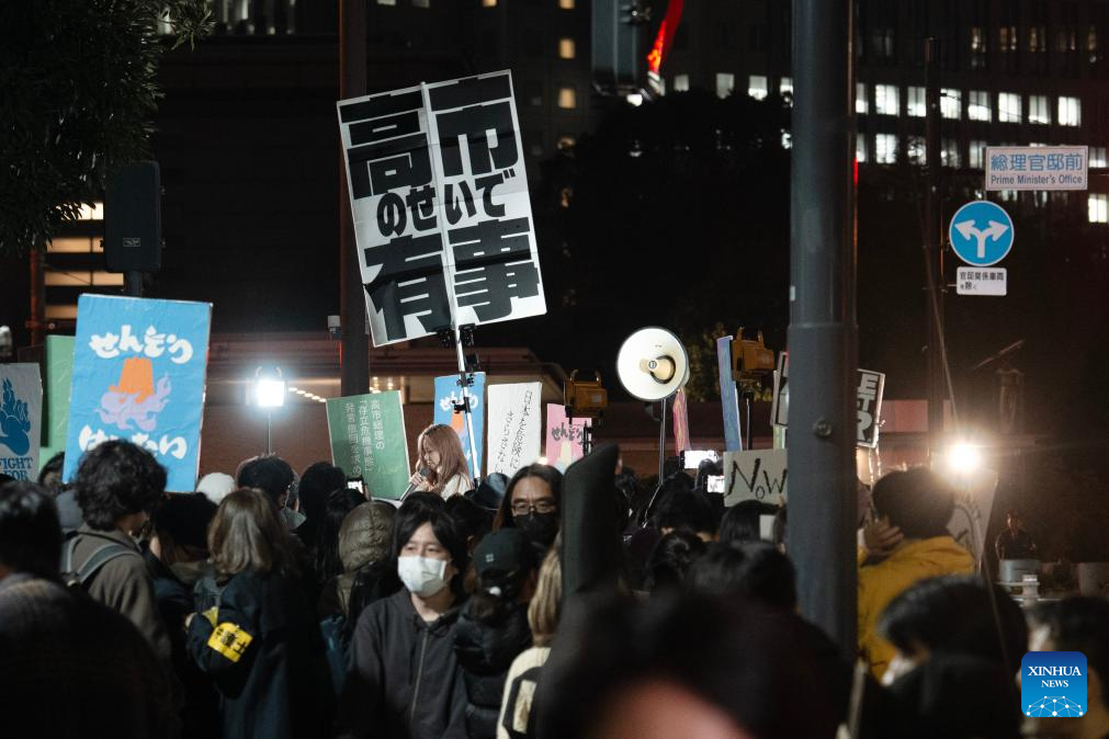 Tóquio, 22 nov (Xinhua) -- Centenas de japoneses fizeram um protesto em frente à residência oficial da primeira-ministra em Tóquio na sexta-feira, exigindo que a primeira-ministra Sanae Takaichi se retratasse de suas recentes declarações equivocadas sobre Taiwan, desse uma explicação e um pedido de desculpas.