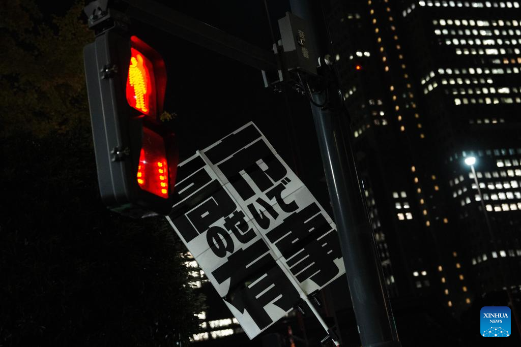 Pessoas participam de protesto em frente à residência oficial da primeira-ministra japonesa em Tóquio, Japão, em 21 de novembro de 2025. Centenas de japoneses fizeram um protesto em frente à residência oficial da primeira-ministra em Tóquio na sexta-feira, exigindo que a primeira-ministra Sanae Takaichi se retratasse de suas recentes declarações equivocadas sobre Taiwan, desse uma explicação e um pedido de desculpas. (Xinhua/Jia Haocheng)