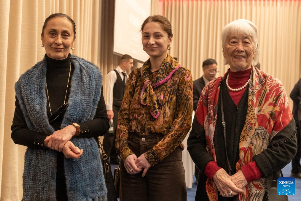 Liu Guangwen (direita), professora veterana da Universidade Livre de Tbilisi, que dedicou décadas ao ensino da língua chinesa na Geórgia, participa de uma recepção para a comunidade chinesa em comemoração à Festa da Primavera com familiares em Tbilisi, Geórgia, em 2 de fevereiro de 2026. A Embaixada da China na Geórgia realizou, na segunda-feira, uma recepção para a comunidade chinesa comemorar a Festa da Primavera, com representantes prometendo continuar servindo como mensageiros do intercâmbio e da cooperação bilateral. (Xinhua/Chen Junfeng)