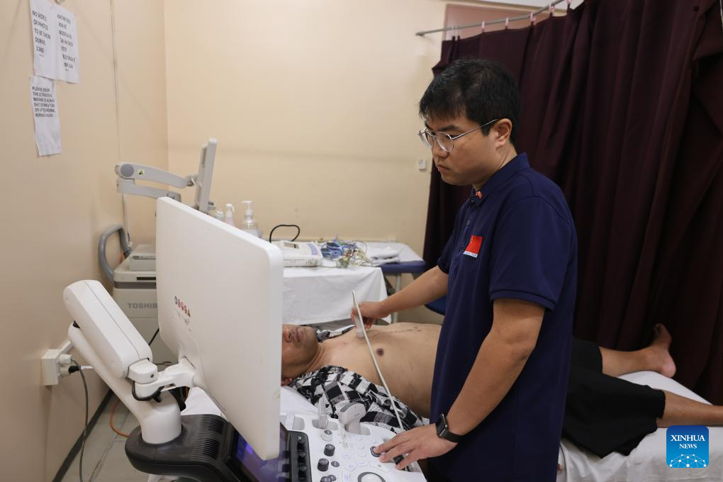 Médico da sexta equipe médica chinesa enviada a Tonga faz exame em Aisea Latu Talia'uli em Nuku'alofa, Tonga, em 8 de novembro de 2025. (Sexta equipe médica chinesa enviada a Tonga/Divulgação via Xinhua)