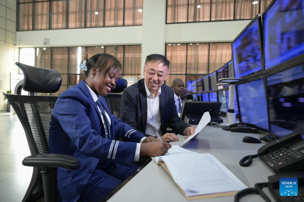 Damaris Mutinda e Feng Xudong, chefe do departamento de transporte e despacho da Africa Star Railway Operation Company, operadora da Ferrovia Mombasa-Nairobi de Bitola Padrão (SGR, na sigla em inglês) de fabricação chinesa, verificam o registro de trabalho no Centro de Despacho Ferroviário da Ferrovia Mombasa-Nairobi de Bitola Padrão (SGR) da Kenya Railways em Nairóbi, Quênia, em 30 de setembro de 2025. (Xinhua/Yang Guang)
