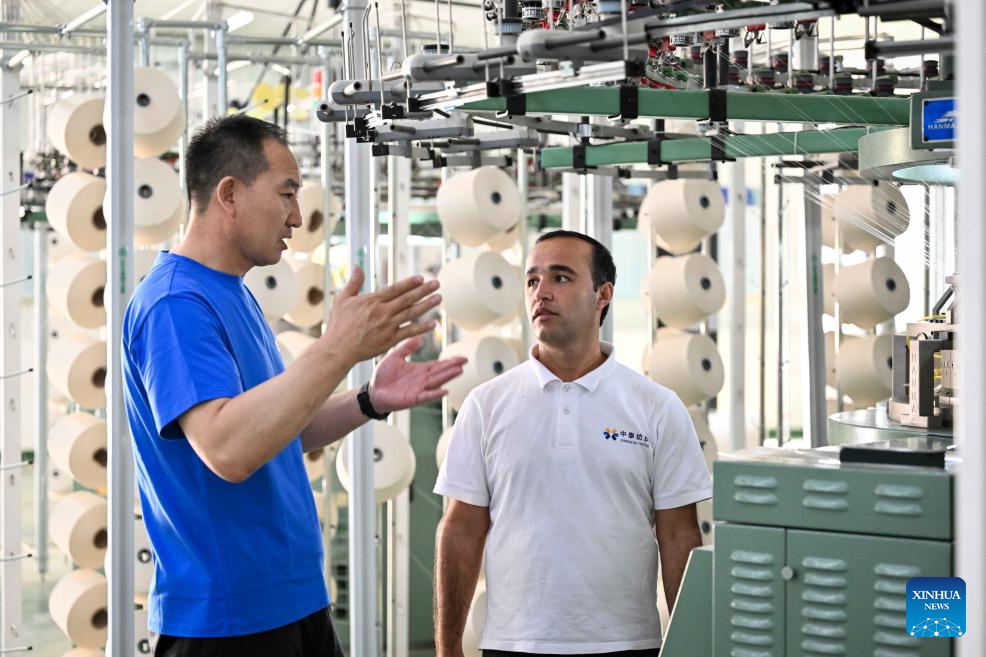Um gerente chinês de oficina (esquerda) instrui trabalhador tadjique no Parque Industrial Agrícola e Têxtil China-Tadjiquistão de Danghara, em Danghara, Tadjiquistão, em 12 de setembro de 2025. (Xinhua/Li Renzi)