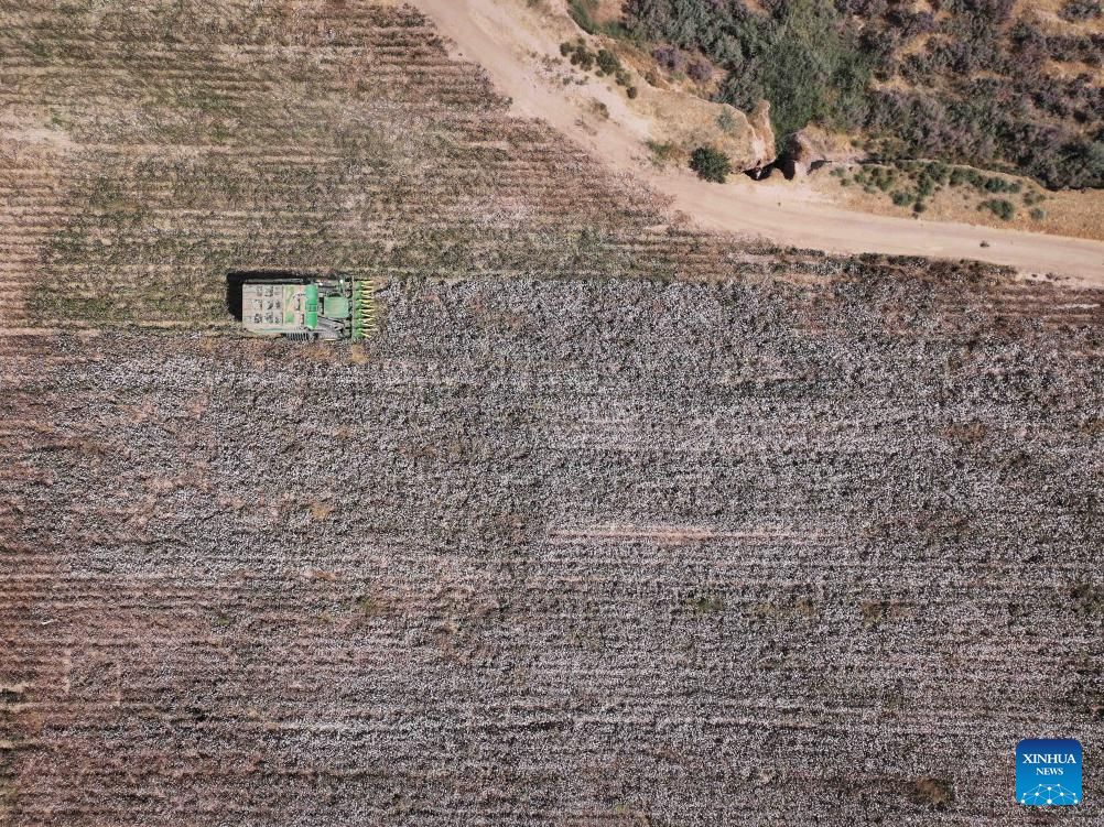 Foto aérea de drone mostra colhedora de algodão operando em uma plantação de algodão em Danghara, Tadjiquistão, em 12 de setembro de 2025. (Xinhua/Li Renzi)