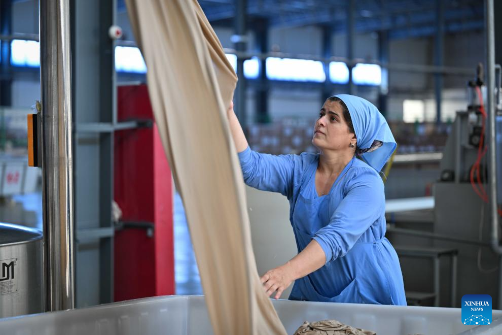 Mulher trabalha no Parque Industrial Agrícola e Têxtil China-Tadjiquistão de Danghara em Danghara, Tadjiquistão, em 12 de setembro de 2025. (Xinhua/Li Renzi)