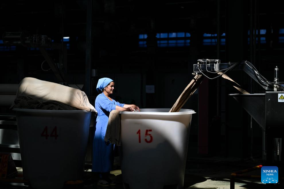 Mulher trabalha no Parque Industrial Agrícola e Têxtil China-Tadjiquistão de Danghara, em Danghara, Tadjiquistão, em 12 de setembro de 2025. (Xinhua/Li Renzi)