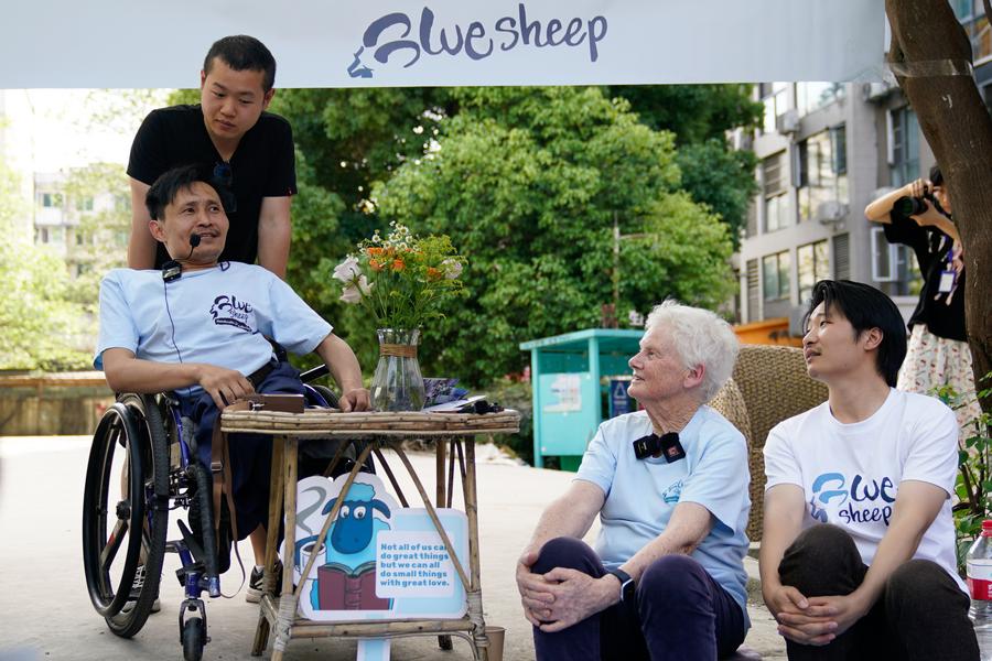 Rachel Grace Pinniger (2ª à direita) ouve história de vida de artesão com deficiência em Chengdu, Província de Sichuan, sudoeste da China, em 19 de abril de 2025. (Xinhua/Xu Bingjie)