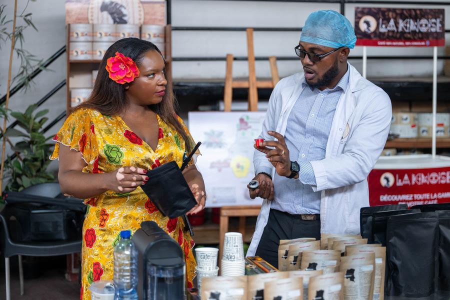 Tisya Mukuna, fundadora da marca de café "La Kinoise", conversa com seu funcionário em uma fábrica em Kinshasa, República Democrática do Congo (RDC), em 29 de setembro de 2025. (Xinhua/Zheng Yangzi)