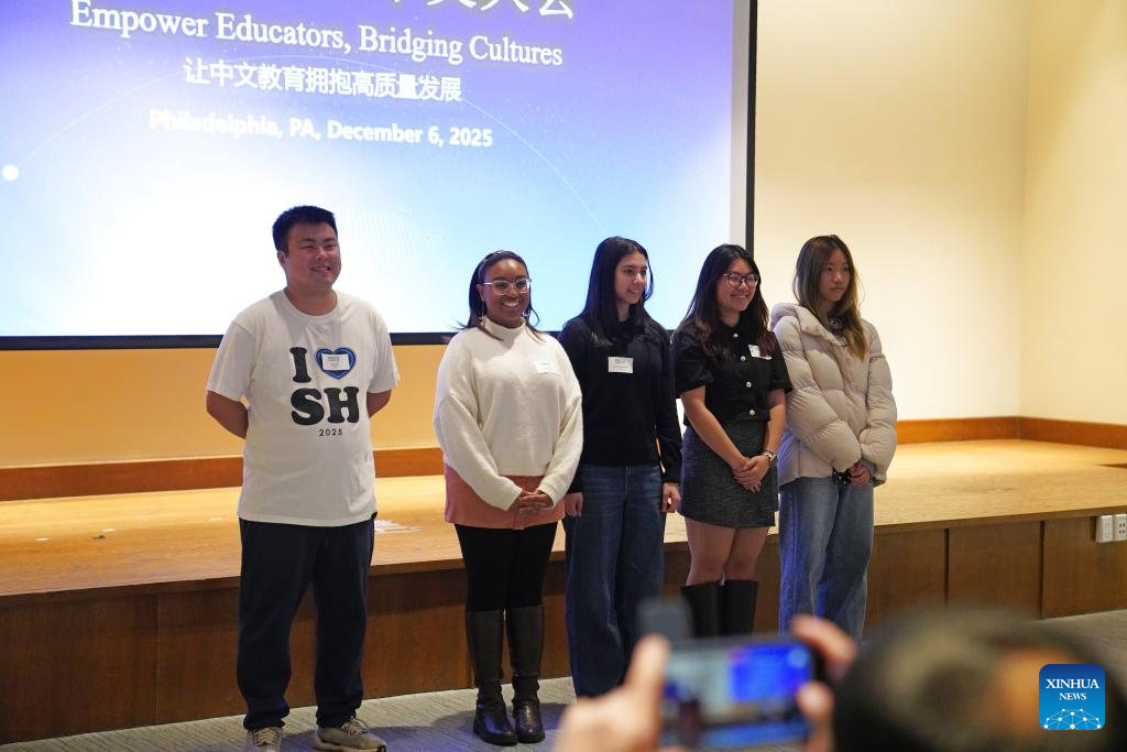 Representantes estudantis participam da Conferência de Língua Chinesa da Pensilvânia na Universidade de Saint Joseph, na Filadélfia, Estados Unidos, em 6 de dezembro de 2025.