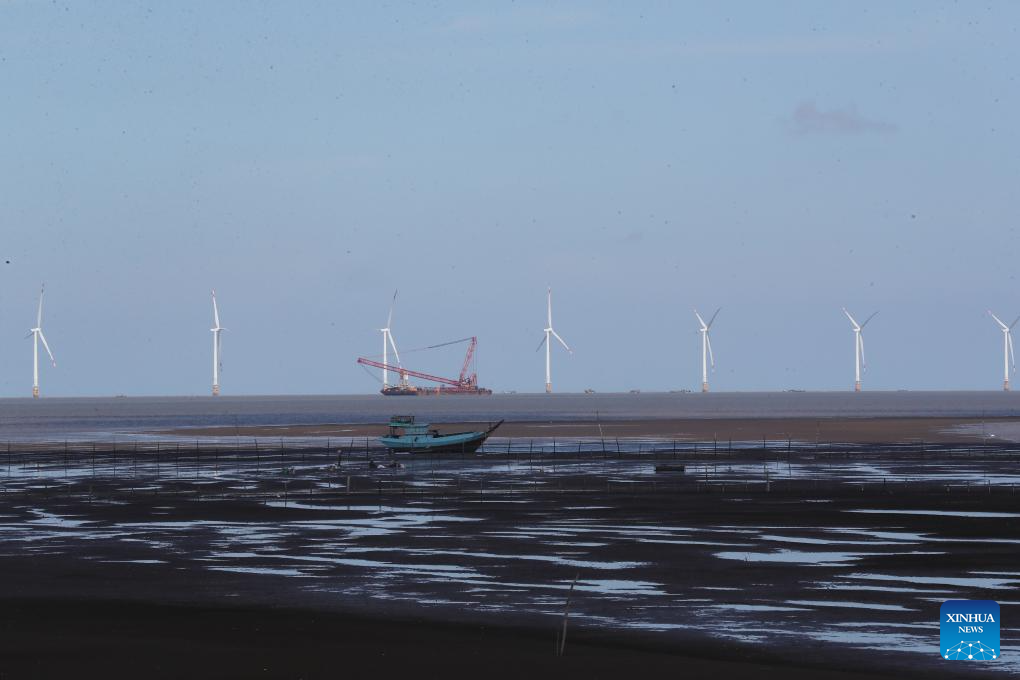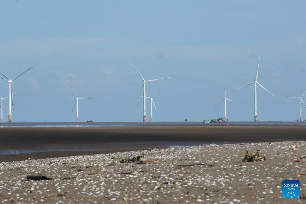 Turbinas eólicas de um projeto de energia eólica offshore construído pela Power Construction Corporation of China (PowerChina) são mostradas em Binh Dai, província de Vinh Long, Vietnã, em 14 de outubro de 2025. (Xinhua/Liu Ying)