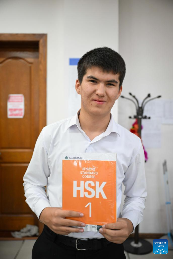 Um estudante mostra seu livro didático do curso de língua chinesa no local de ensino do Salão Chinês do Instituto Confúcio, na Biblioteca Nacional de Dushanbe, Tadjiquistão, em 12 de setembro de 2025. (Xinhua/Li Renzi)