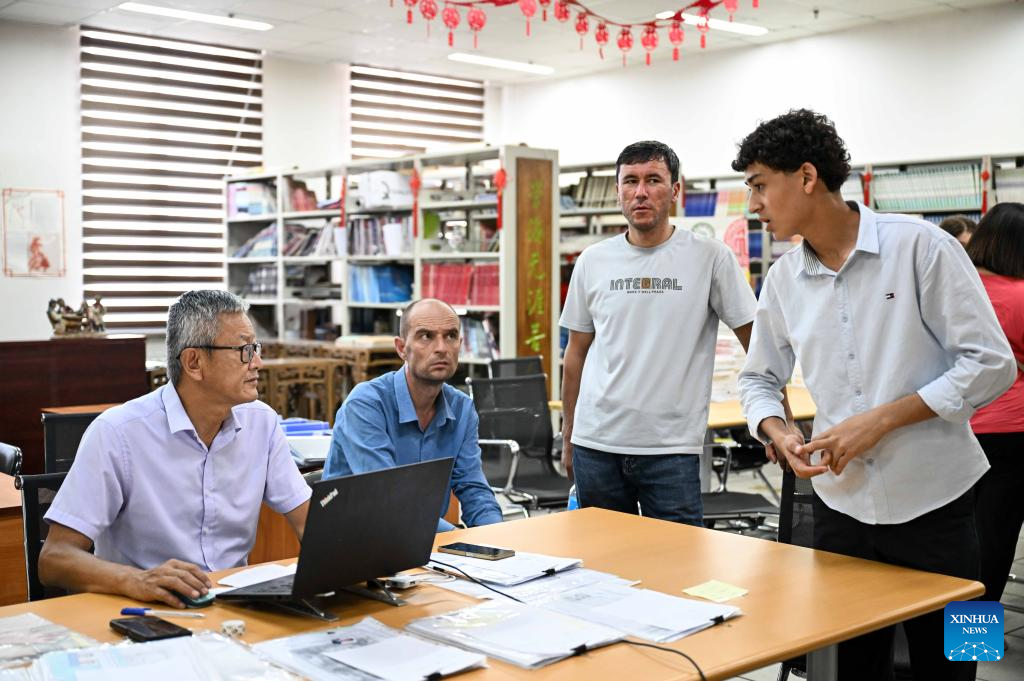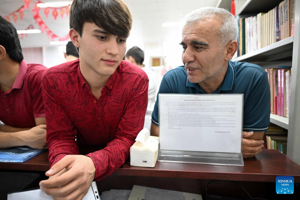 Abdullakhim (1º à direita) conversa com Li Jianjun (1º à esquerda) no local de inscrição de ensino do Salão Chinês do Instituto Confúcio, na Biblioteca Nacional de Dushanbe, Tadjiquistão, em 12 de setembro de 2025. (Xinhua/Li Renzi)