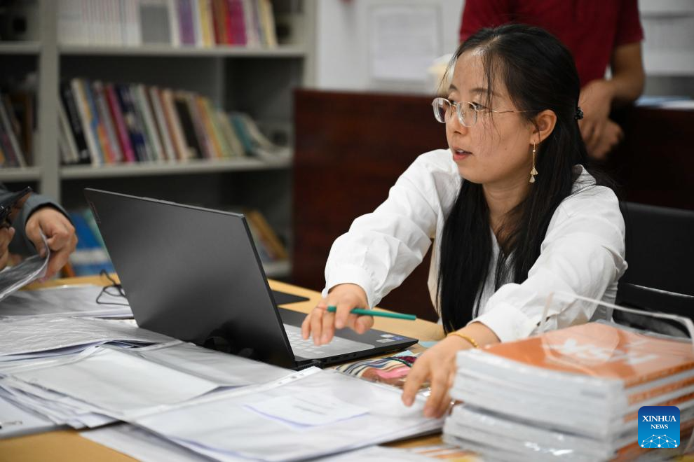 Wang Huijuan trabalha no local de inscrição de ensino do Salão Chinês do Instituto Confúcio, na Biblioteca Nacional de Dushanbe, Tadjiquistão, em 12 de setembro de 2025. 12 de setembro de 2025. (Xinhua/Li Renzi)