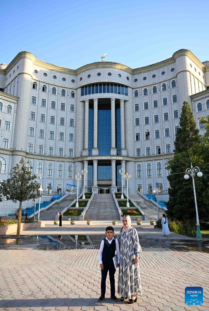Yusuf e sua mãe posam para foto em frente à Biblioteca Nacional em Dushanbe, Tadjiquistão, em 12 de setembro de 2025. (Xinhua/Li Renzi)