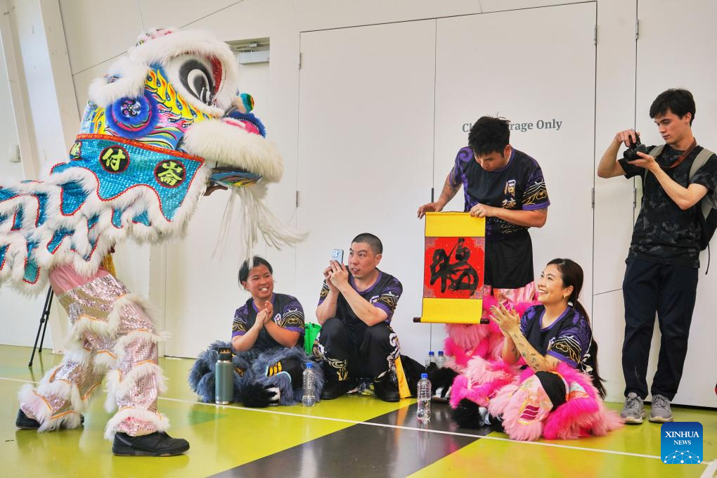 Equipe se apresenta na competição de dança do leão em Christchurch, Nova Zelândia, em 25 de outubro de 2025. (Foto por Chen Siyumeng/Xinhua)