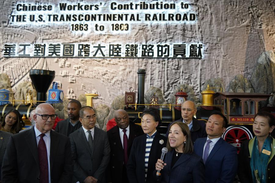 A vice-governadora da Califórnia, Eleni Kounalakis (3ª à direita), discursa na cerimônia de inauguração de um centro histórico construído para homenagear os trabalhadores ferroviários chineses que concluíram a Ferrovia Transcontinental em 10 de maio de 1869, em São Francisco, Califórnia, Estados Unidos, em 10 de maio de 2023. (Xinhua/Wu Xiaoling)