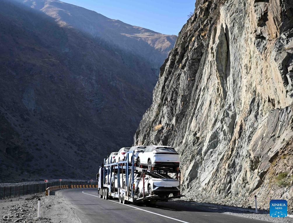 Veículo transportando automóveis de marca chinesa trafega no trecho da segunda fase da Rodovia China-Tadjiquistão, perto de Kalai Khumb, Tadjiquistão, em 11 de setembro de 2025. A Rodovia China-Tadjiquistão, também conhecida como Rodovia Pamir, foi construída na década de 1940. Com mais de 1.000 km de extensão, de Dushanbe a Karasu, na fronteira entre a China e o Tadjiquistão, ela é vital para o transporte e as conexões externas do Tadjiquistão. (Xinhua/Li Renzi)