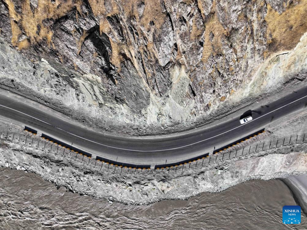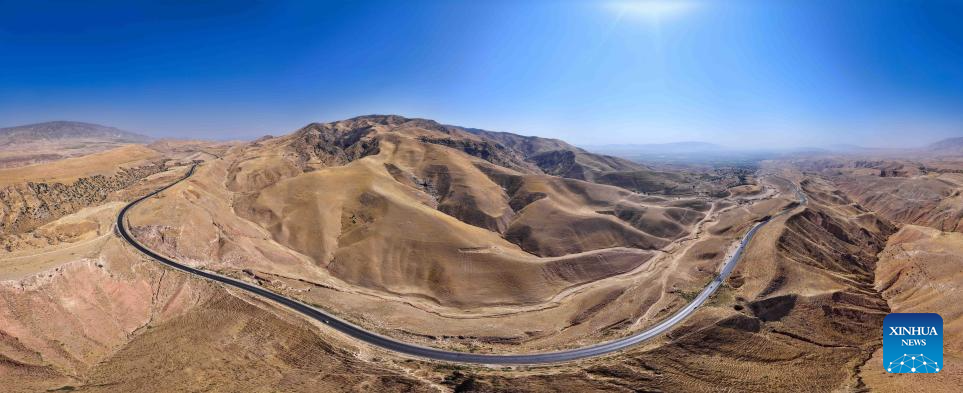 Foto aérea de drone mostra parte do trecho da segunda fase da Rodovia China-Tadjiquistão, perto de Kalai Khumb, no Tadjiquistão, em 11 de setembro de 2025. A Rodovia China-Tadjiquistão, também conhecida como Rodovia Pamir, foi construída na década de 1940. Com mais de 1.000 km de extensão, de Dushanbe a Karasu, na fronteira entre a China e o Tadjiquistão, ela é vital para o transporte e as conexões externas do Tadjiquistão. (Xinhua/Li Renzi)