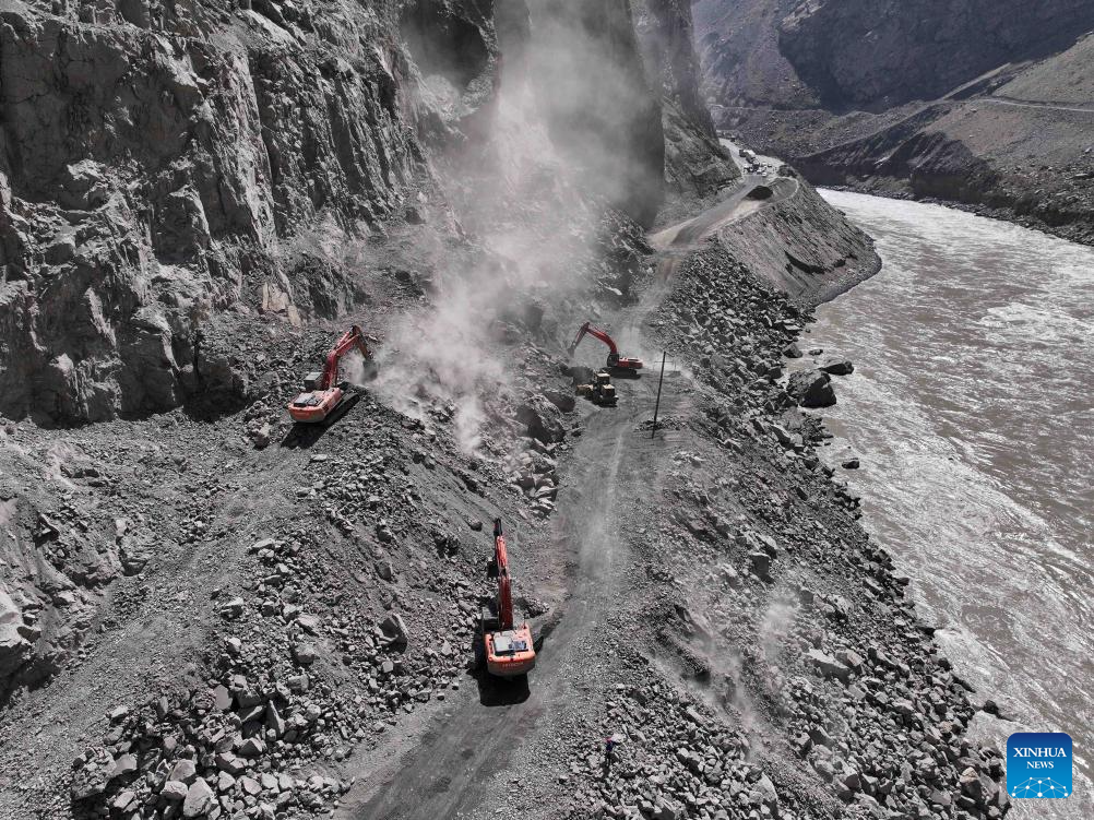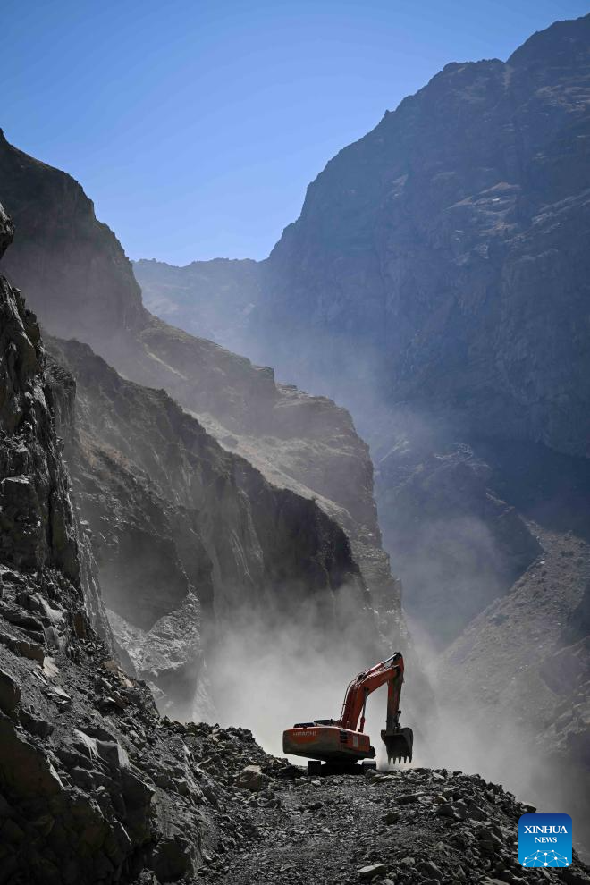 Escavadeiras operam no canteiro de obras do trecho da segunda fase da Rodovia China-Tadjiquistão, perto de Kalai Khumb, Tadjiquistão, em 11 de setembro de 2025. A Rodovia China-Tadjiquistão, também conhecida como Rodovia Pamir, foi construída na década de 1940. Com mais de 1.000 km de extensão, de Dushanbe a Karasu, na fronteira entre a China e o Tadjiquistão, ela é vital para o transporte e as conexões externas do Tadjiquistão. (Xinhua/Li Renzi)
