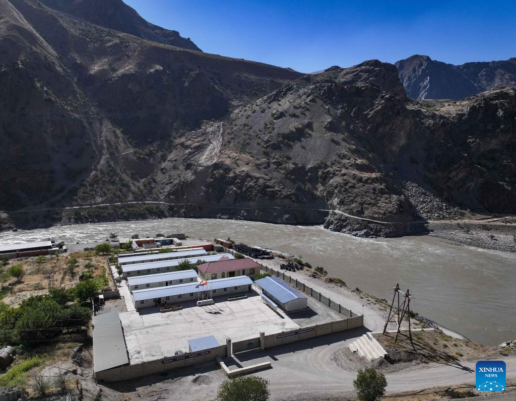 Foto aérea de drone mostra acampamento da China Road and Bridge Corporation (CRBC) perto de Kalai Khumb, Tadjiquistão, em 11 de setembro de 2025. A Rodovia China-Tadjiquistão, também conhecida como Rodovia Pamir, foi construída na década de 1940. Com mais de 1.000 km de extensão, de Dushanbe a Karasu, na fronteira entre a China e o Tadjiquistão, ela é vital para o transporte e as conexões externas do Tadjiquistão. (Xinhua/Li Renzi)